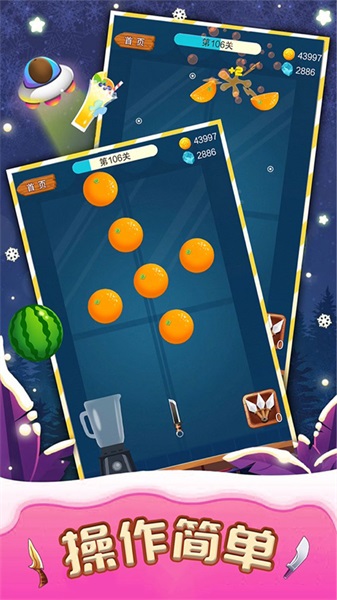 游戏中包含诸多精彩的玩法,每个关卡都呈现出别具一格的游戏方式。关卡数量极为丰富,玩家能够自由选择挑战。玩家还可通过完成任务解锁心仪的刀具,如此便能更迅速地切开新鲜水果。每天都得将美味水果榨成果汁,售卖给顾客。各式各样美味的水果,足以满足顾客的味蕾。