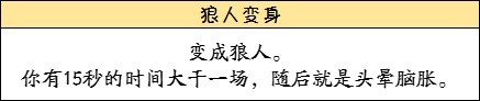 这个主动技能就是狼人最特别的地方了,简单来讲就是,你可以拥有15秒的狼人时间,15秒后会进入眩晕状态5秒,同时技能会进入20秒的CD,从狼人时间结束开始算。