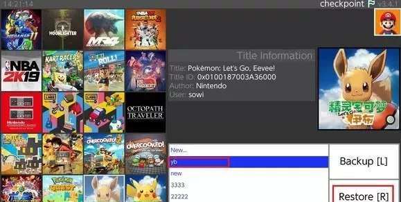 前面步骤和备份一样,进入CheckPoint后,选择要还原的游戏,让光标停留在New…的位置