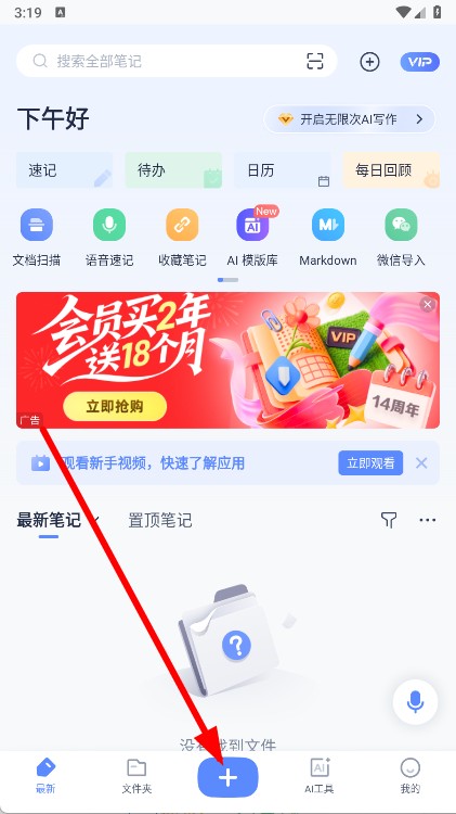 1、打开,进入首页后,点击底部中间的+按钮,开始创建新笔记。