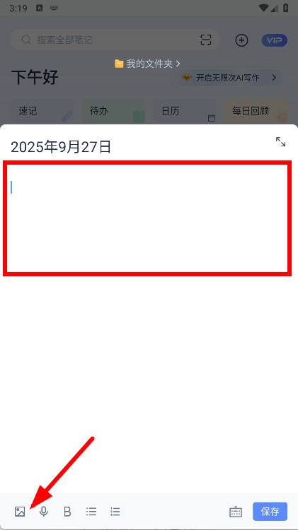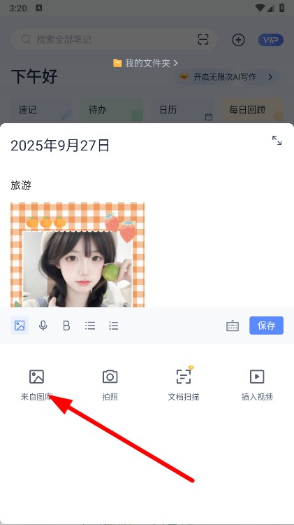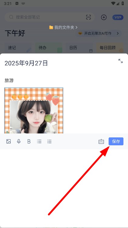 5、完成笔记内容编辑后,点击右上角的保存按钮,即可将带有图片的笔记保存。