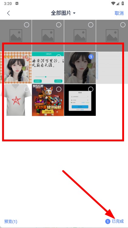 4、在图库中勾选目标图片后,点击已完成,完成图片插入。