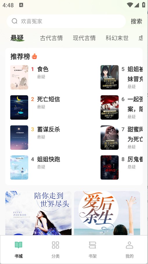 2. 进入首页,在“书城”和“分类”页面中,存在大量小说资源,涵盖言情、科幻、武侠等多种类型。