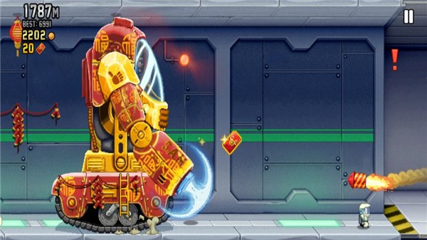 游戏中的Jetpack动力不是传统的燃料动力,你要利用不断发射的子弹来作为上升飞行的动力,玩家要在其中用手指按触屏幕上的任何一个可触发控制的位置灵活的进行操作,灵活的操作在游戏中是非常重要的是,整个逃亡路上你不仅仅要避开各种不同的障碍还要消灭敌人。