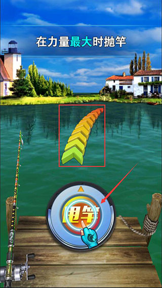 1、首先我们点击开始钓鱼按钮进行抛竿,这时候会出现一个来回闪烁的进度条,进度条满的时候点击下方的甩竿按钮。