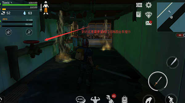 到这里需要管阀门小地图有提示(位置见图)往下走会遇到一个分岔路,需要往右上方走(因为需要先到右上方修复机关才能往下走,不懂得看下图)